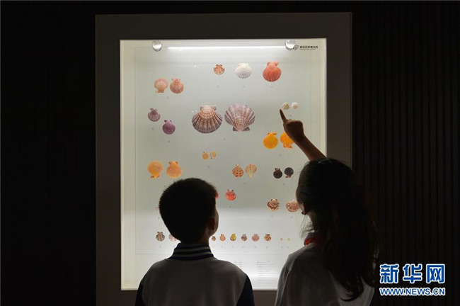 5月16日,兩名學生在青島貝殼博物館參觀展示的扇貝。新華社發(fā)(王海濱 攝)