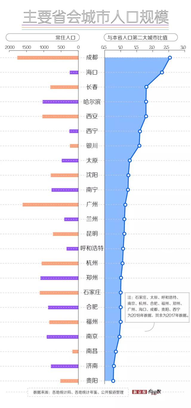 我們可以分三個(gè)區(qū)間來看下方數(shù)據(jù)圖中標(biāo)示的“與本省人口第二大城市比值”:比值大于 1 說明該省會(huì)的人口規(guī)模全省第一,比值等于 1 說明該省會(huì)是全省人口第二大城市,比值小于 1 說明該省會(huì)的人口規(guī)模要排在全省第三甚至更后。