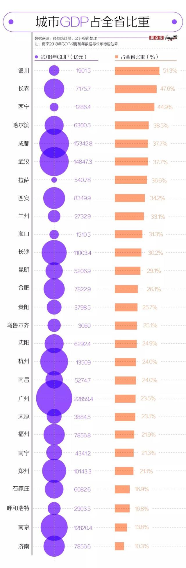 我們梳理了 27 個(gè)省和自治區(qū) 2018 年的地區(qū)生產(chǎn)總值后發(fā)現(xiàn),目前西藏、青海、寧夏、海南、甘肅五地 GDP 未破萬億,所以相應(yīng)的拉薩、西寧、銀川、??凇⑻m州留給大家的記憶點(diǎn)可能不多;而像江蘇、山東兩地 GDP 可以排在全國前十,但其省會(huì)城市南京、濟(jì)南的 GDP 占全省比重不到 15%。