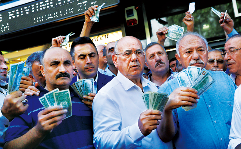 2018年,由于美聯(lián)儲加息導(dǎo)致國際游資大規(guī)?;亓?,美國對土耳其、伊朗進行制裁以及貿(mào)易保護主義的影響,俄羅斯、阿根廷、土耳其、南非等不少經(jīng)濟體貨幣遭遇大幅貶值。圖為2018年8月14日,在土耳其首都安卡拉,人們響應(yīng)政府號召,手持美元站在貨幣兌換處前,出售手中的美元支持本國貨幣里拉。 新華社/路透