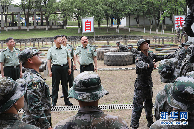 5月21日,中共中央總書記、國家主席、中央軍委主席習(xí)近平到陸軍步兵學(xué)院視察。這是習(xí)近平觀看學(xué)員進行極限訓(xùn)練。新華社記者 李剛 攝