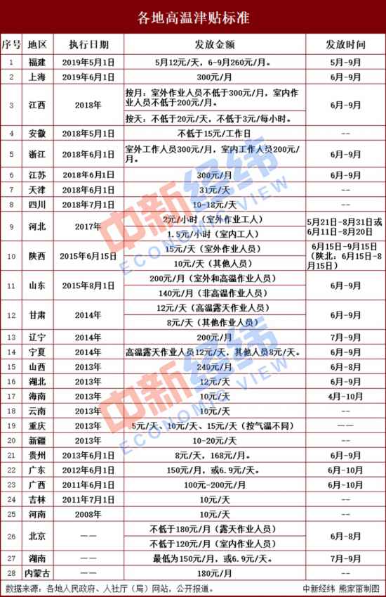 中新經(jīng)緯客戶端注意到,截至2019年5月23日,部分地區(qū)的高溫津貼實施辦法已超過有效期,這些省份或可能對高溫津貼標準進行調(diào)整。