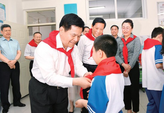 李紀(jì)恒來到一年級二班,“愛祖國、擔(dān)大任,爭做新時代好隊(duì)員”主題隊(duì)日活動正在舉行,一名少先隊(duì)員走上前來,為他戴上鮮艷的紅領(lǐng)巾。李紀(jì)恒說,看到小朋友們快樂活潑、朝氣蓬勃,我很高興,“六一”國際兒童節(jié)快到了,我提前祝大家和全區(qū)的小朋友們節(jié)日快樂、學(xué)習(xí)進(jìn)步、健康成長。
