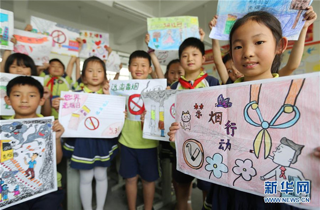 5月30日,臨沂市沂南縣第五實(shí)驗(yàn)小學(xué)的學(xué)生在展示繪制的無煙日手抄報(bào)。新華社發(fā)(王彥冰 攝)