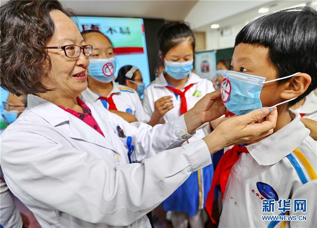 5月30日,秦皇島市第一醫(yī)院醫(yī)務(wù)工作者為東華里小學(xué)學(xué)生佩戴禁煙標(biāo)識(shí)口罩。新華社發(fā)(曹建雄 攝)