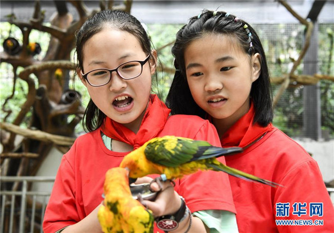 5月29日,在重慶市動物園內的互動區(qū),蓼子鄉(xiāng)第一中心小學的學生們給鸚鵡喂食。新華社記者 劉潺 攝