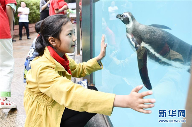5月29日,在重慶市動物園內的互動區(qū),蓼子鄉(xiāng)第一中心小學的馬嬌陽在觀賞企鵝。新華社記者 劉潺 攝
