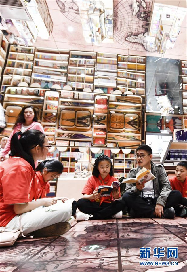 5月29日,在重慶市九龍坡區(qū)一家書店內,重慶鐵路小學的老師鄧賢莎(右二)和蓼子鄉(xiāng)第一中心小學的學生一起讀書。新華社記者 劉潺 攝