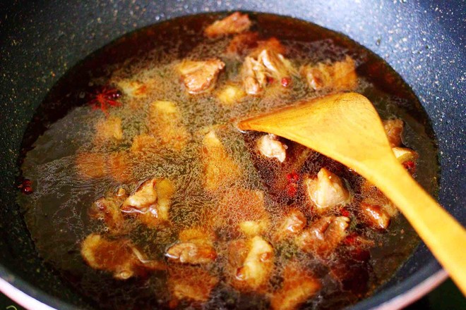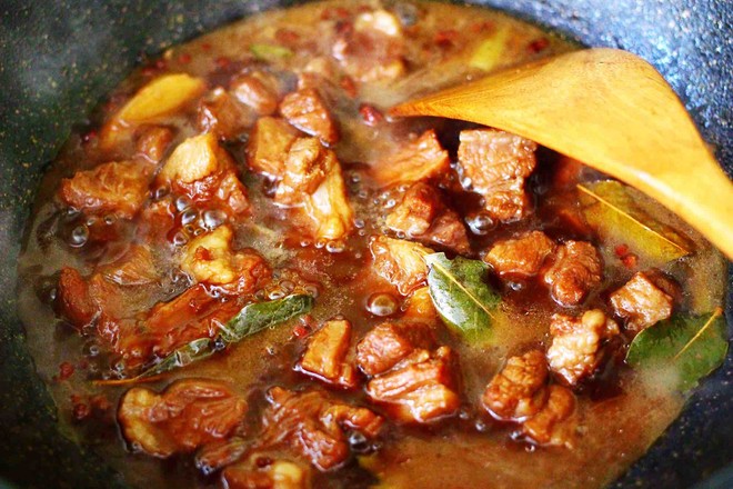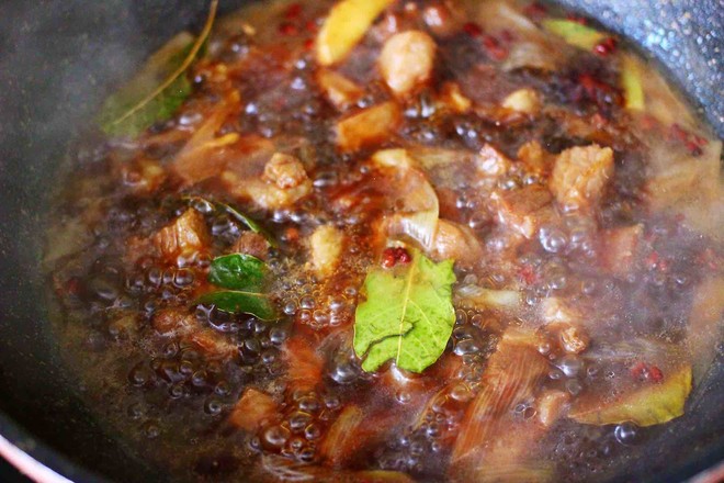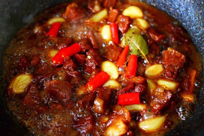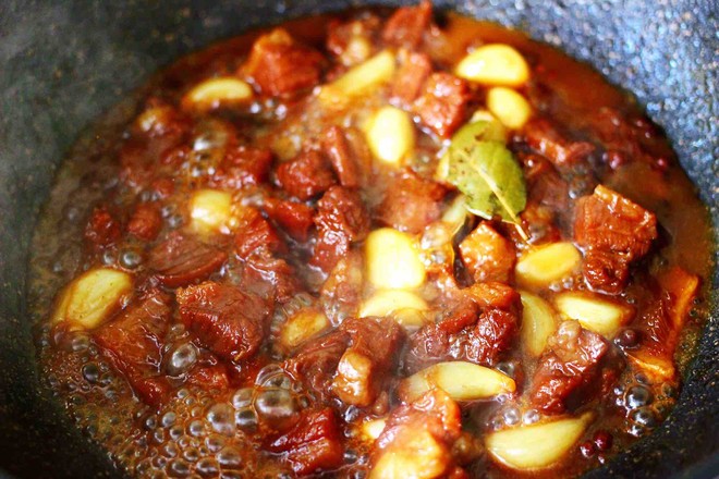 17.小火繼續(xù)燉煮至牛肉和大蒜變得軟糯的時候。