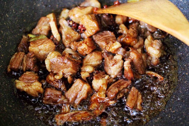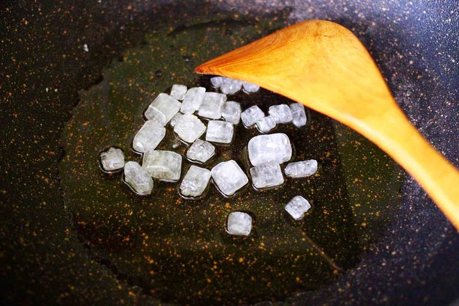 7.鍋中燒熱倒入花生油,放入冰糖小火慢慢炒至融化變成黃色。