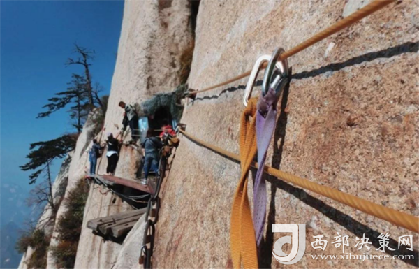 長空棧道位于華山南峰東側(cè)山腰,是華山派第一代宗師,元朝初年的賀志真為遠離塵世靜修成仙搭建而成。這段百余米懸空的棧道是在萬仞絕壁上鑿出來幾個踏腳之處,又在之上鑲嵌石釘搭木椽而筑,距今已經(jīng)有700多年的歷史,后人爬行至此都驚恐萬分。