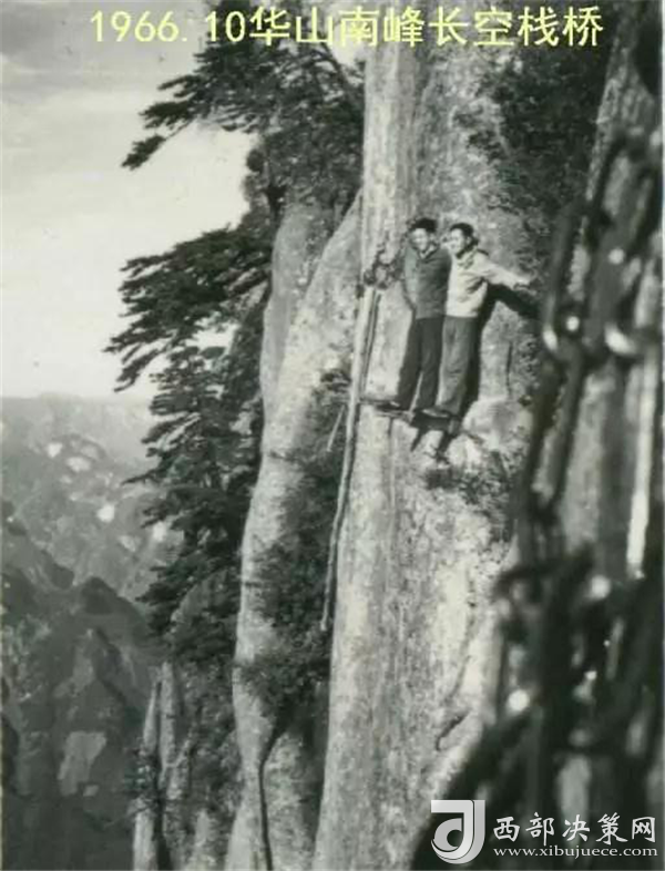 我照相的時候,一只手抓鐵鏈,一只手做動作,身體是緊貼石壁。難得的是當(dāng)年一起去的一個女生給我照相,在我對面一樣危險,但女俠單手抓鐵鏈,整個身體外突懸在半空中,另一只手拿相機找一個最好角度給我拍照,我都替她擔(dān)心。——摘自網(wǎng)友2003年爬華山的游記