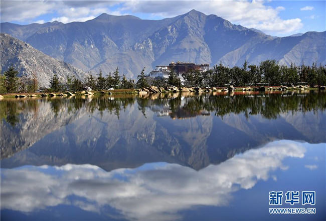 6月5日拍攝的藍天白云和綠水之間的布達拉宮。新華社記者 覺果 攝