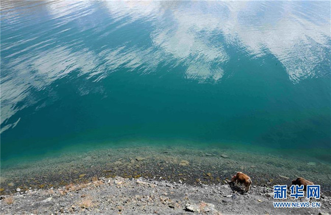 兩頭牛在西藏羊湖邊喝水(5月24日攝)。新華社記者 普布扎西 攝