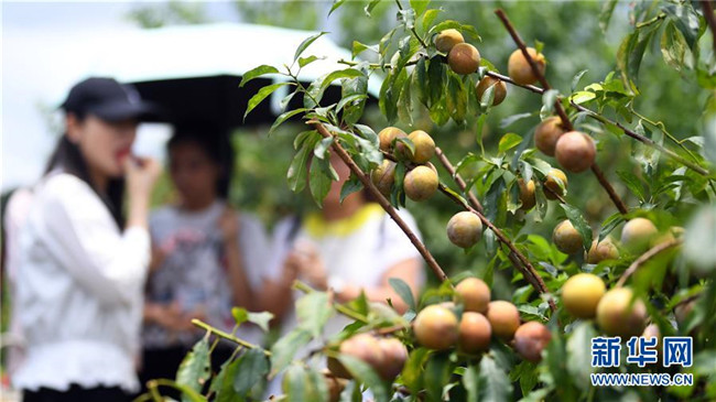 6月11日,游客在欽南區(qū)那麗鎮(zhèn)殿艮村的“扶貧李園”游玩。