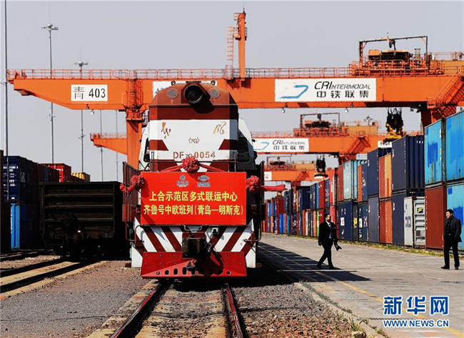 齊魯號(hào)中歐班列(青島—明斯克)從位于青島的中國(guó)—上海合作組織地方經(jīng)貿(mào)合作示范園發(fā)車(4月2日攝)。新華社記者 李紫恒 攝