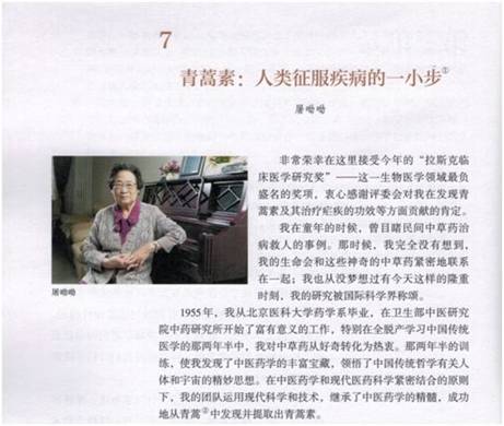 據(jù)悉,今年秋季學(xué)期將開始推廣的統(tǒng)編高中語文教材已確定將屠呦呦2011年的獲獎感言及同年發(fā)表的論文改編成課文《青蒿素:人類征服疾病的一小步》。人民教育出版社有關(guān)負責(zé)人介紹,屠呦呦在青年時期培養(yǎng)了對傳統(tǒng)醫(yī)藥學(xué)的熱愛,歷經(jīng)數(shù)年終于從古代藥典中獲得靈感,發(fā)現(xiàn)了青蒿素,并且至今仍在科學(xué)探索道路上孜孜以求。此次選錄這篇文章,旨在引導(dǎo)學(xué)生了解和尊重科學(xué),從屠呦呦的科研歷程中汲取力量。