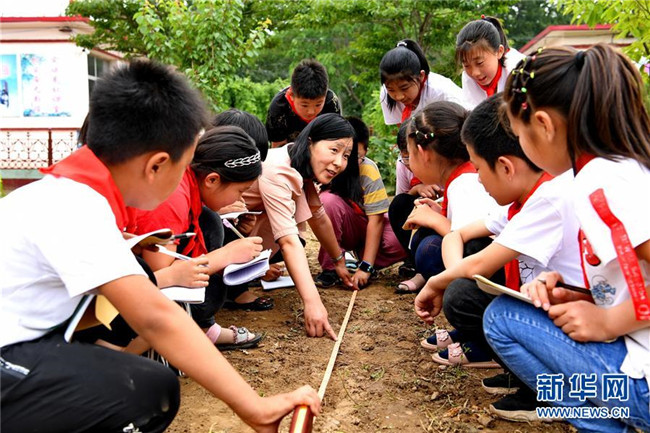 6月17日,樂亭縣汀流河鎮(zhèn)楊各莊小學(xué)的老師在校園勞動(dòng)實(shí)踐基地內(nèi)為學(xué)生講解土地丈量知識(shí)。新華社記者楊世堯攝