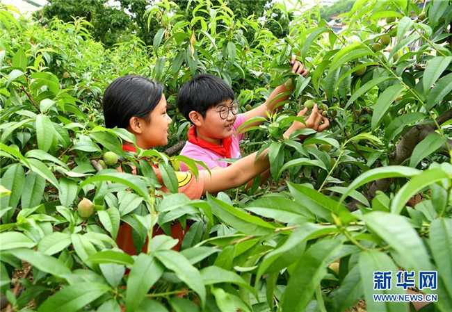 6月17日,樂亭縣毛莊鎮(zhèn)松各莊小學(xué)的學(xué)生在校園勞動(dòng)實(shí)踐基地果園內(nèi)觀察桃子的長(zhǎng)勢(shì)。新華社記者楊世堯攝