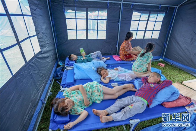 6月18日,在長(zhǎng)寧縣雙河鎮(zhèn)雙河中學(xué)安置點(diǎn),受災(zāi)群眾在帳篷里休息。新華社發(fā)(劉昌松攝)