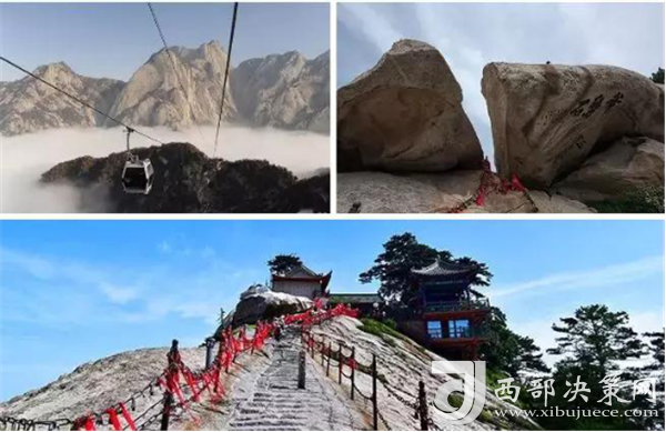 華山著名景區(qū)多達210余處,有凌空架設的長空棧道,三面臨空的鷂子翻身,以及在峭壁絕崖上鑿出的千尺幢、百尺峽、老君犁溝等,其中華岳仙掌被列為關(guān)中八景之首。