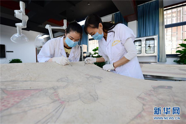 在洛陽市文物考古研究院,西北大學(xué)文物保護(hù)技術(shù)專業(yè)學(xué)生田丹玉(左)和壁畫修復(fù)師田玉娥清理一件唐代壁畫(5月22日攝)。新華社記者李一博攝