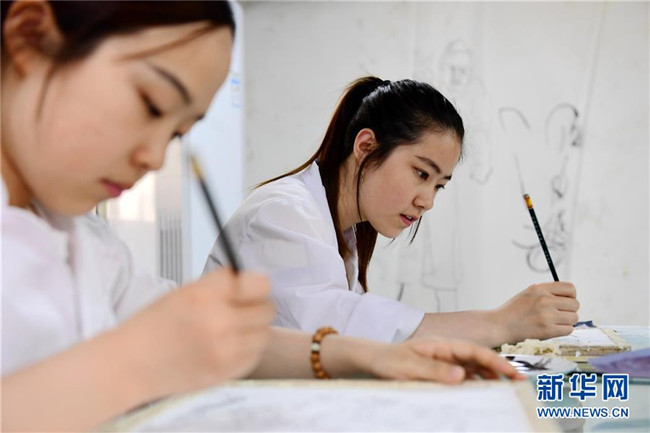 在洛陽市文物考古研究院,西北大學(xué)文物保護(hù)技術(shù)專業(yè)學(xué)生田丹玉(右)和梁楚昕在臨摹壁畫(5月22日攝)。新華社記者李一博攝