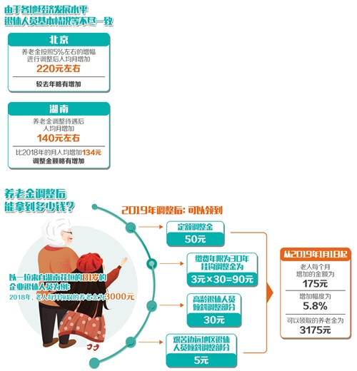 比如,北京市人力資源和社會保障局發(fā)布的調(diào)整方案顯示,養(yǎng)老金按照5%左右的增幅進行調(diào)整后,人均增加220元左右,較去年略有增加;湖南省公布的退休人員養(yǎng)老金調(diào)整方案顯示,養(yǎng)老金調(diào)整后,人均月增加金額為140元左右,比2018年的月人均增加134元,調(diào)整金額略有增加;寧夏決定從2019年1月1日起調(diào)整全區(qū)企業(yè)和機關(guān)事業(yè)單位退休人員基本養(yǎng)老金,其中企業(yè)提高比例為5.5%,機關(guān)事業(yè)單位提高比例為4%,預(yù)計全區(qū)共有63.67萬人受益。
