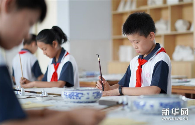 6月26日,內(nèi)丘縣實(shí)驗(yàn)小學(xué)學(xué)生在參加書法特色課程。 新華社記者 朱旭東 攝