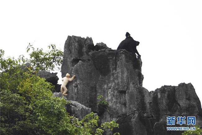 7月4日,白化黑葉猴幼體和同種群其他黑葉猴出現(xiàn)在廣西大新縣桃城鎮(zhèn)寶新村城南小學后山上。 新華社記者 曹祎銘 攝
