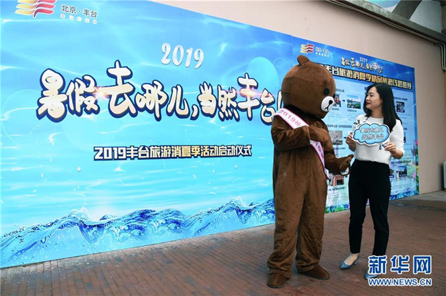 7月6日,市民在2019豐臺(tái)旅游消夏季活動(dòng)啟動(dòng)儀式上與吉祥物互動(dòng)。 新華社發(fā)(任超 攝)