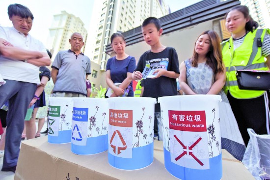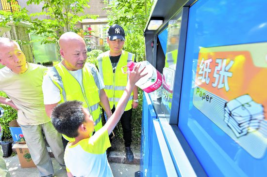 圖①:7月7日,社區(qū)垃圾分類志愿者協(xié)助小朋友進(jìn)行垃圾分類投放。