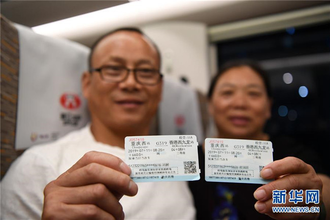 7月11日,乘坐G319次列車的乘客展示前往香港的車票。當(dāng)日,重慶至香港直達(dá)高鐵正式開(kāi)通,此次首發(fā)的G319次復(fù)興號(hào)列車運(yùn)行速度350km/h,沿途經(jīng)停遵義、貴陽(yáng)東、桂林西、肇慶東、廣州南和深圳北站。列車由重慶西站至香港西九龍站全程運(yùn)行需7小時(shí)37分鐘,全程票二等座票價(jià)為660元。目前內(nèi)地與香港聯(lián)通的高鐵車站已增加到58個(gè)。新華社記者唐奕攝