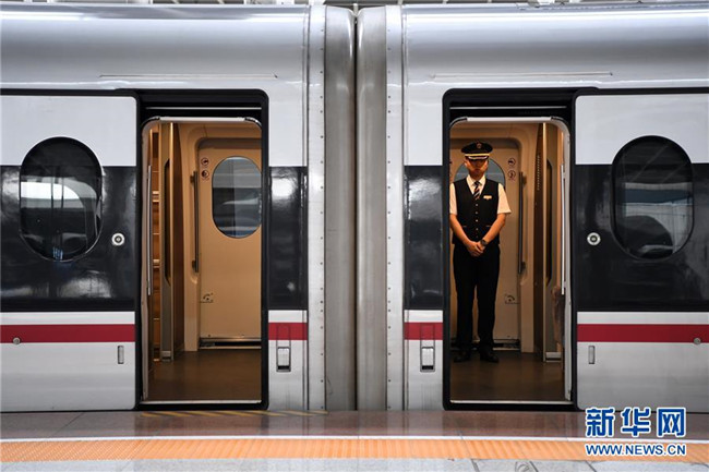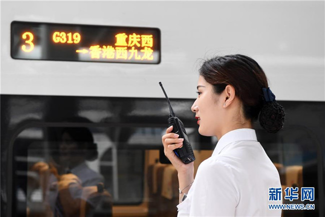 7月11日,乘務(wù)員在G319次列車上等待旅客上車。當(dāng)日,重慶至香港直達(dá)高鐵正式開(kāi)通,此次首發(fā)的G319次復(fù)興號(hào)列車運(yùn)行速度350km/h,沿途經(jīng)停遵義、貴陽(yáng)東、桂林西、肇慶東、廣州南和深圳北站。列車由重慶西站至香港西九龍站全程運(yùn)行需7小時(shí)37分鐘,全程票二等座票價(jià)為660元。目前內(nèi)地與香港聯(lián)通的高鐵車站已增加到58個(gè)。新華社記者唐奕攝