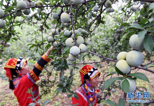 云南元謀縣新華鄉(xiāng)新平村的彝族婦女在果園采摘桃李(7月13日攝)。新華社記者 楊宗友 攝
