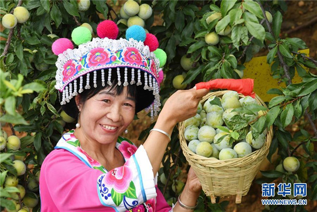 云南元謀縣新華鄉(xiāng)新平村的彝族婦女展示采摘的桃李(7月13日攝)。新華社記者 楊宗友 攝
