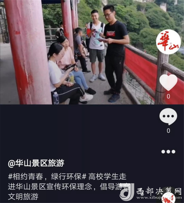 活動還通過高校網(wǎng)絡(luò)紅人拍攝抖音“青春最美,華山見證”主題短視頻等傳播方式,在網(wǎng)絡(luò)線上形成熱度,為華山綠色環(huán)保游提供了新方式。