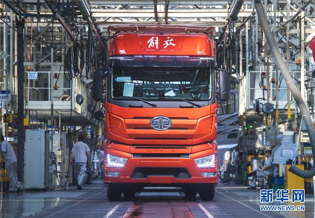 這是在位于吉林長春的一汽解放總裝車間內拍攝的待出廠的解放J7卡車(6月12日攝)。新華社記者許暢攝