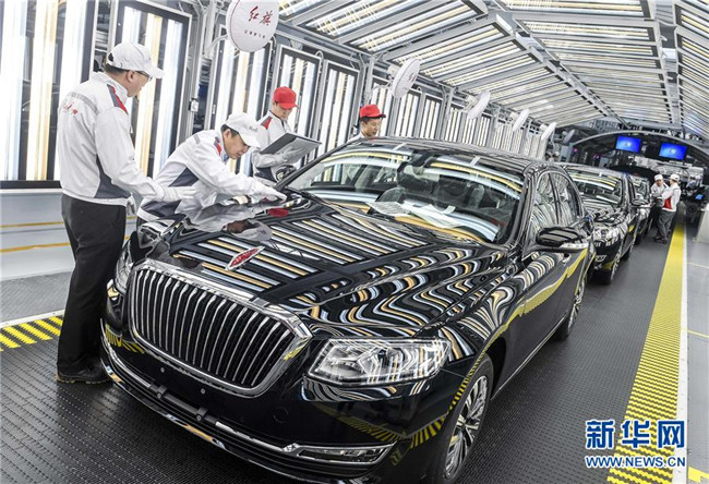 工人在位于吉林長春的一汽紅旗總裝車間內進行車輛靜檢作業(yè)(4月9日攝)。新華社記者許暢攝