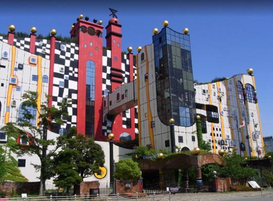 而在《名偵探柯南》里出現(xiàn)的垃圾處理廠也有真實(shí)場景。由宮崎駿的偶像百水先生進(jìn)行外觀設(shè)計(jì)的大阪舞洲島垃圾處理廠,遠(yuǎn)遠(yuǎn)看去仿佛游樂場,不知情的人絕不會(huì)把它和垃圾聯(lián)系在一起。處理廠干凈整潔、色彩明亮得恍若安徒生的童話世界,紅黃的條紋象征著燃燒的火焰,形態(tài)各異的可愛窗子與爬山虎裝點(diǎn)著墻壁,標(biāo)志性的長管煙囪令人想起長發(fā)公主的城堡……