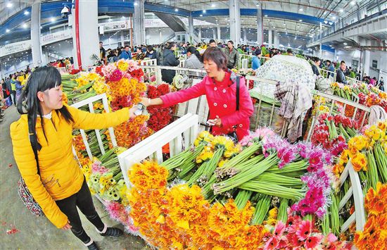 云花是云南省一張亮麗的名片。2018年,云花總產(chǎn)值達(dá)到525.9億元,40多萬(wàn)從業(yè)者參與到這份美好的事業(yè)中,成為脫貧致富和全面建成小康社會(huì)的重要產(chǎn)業(yè)力量。圖為斗南花市上忙碌的賣花人。(記者黃喆春攝)