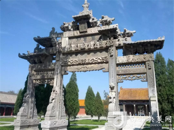 “天威咫尺”石牌樓明萬歷年所建,結(jié)構(gòu)為四柱三開間五樓式金青石牌樓。結(jié)構(gòu)精巧,內(nèi)容豐富,雕刻手法細(xì)致、全面。運(yùn)用圓雕、浮雕、線雕、透雕等各種雕刻手法。