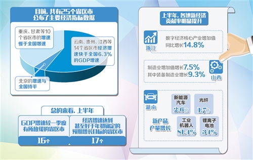 原標(biāo)題:25個(gè)省區(qū)市陸續(xù)公布上半年“成績(jī)單”:各地經(jīng)濟(jì)運(yùn)行平穩(wěn) 新興動(dòng)能貢獻(xiàn)突出