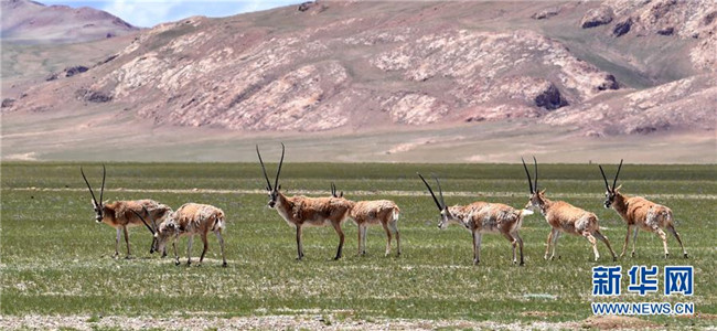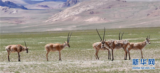 8月4日,藏羚羊在覓食。西藏那曲市尼瑪縣位于西藏西北部,位于羌塘國家級自然保護(hù)區(qū)內(nèi),是古老象雄文明的發(fā)祥地之一。這里空氣潔凈,野生動物繁多,深受游客喜愛。新華社記者覺果攝