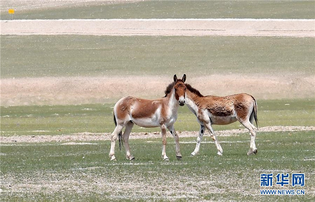 8月4日拍攝的兩頭藏野驢。西藏那曲市尼瑪縣位于西藏西北部,位于羌塘國家級自然保護(hù)區(qū)內(nèi),是古老象雄文明的發(fā)祥地之一。這里空氣潔凈,野生動物繁多,深受游客喜愛。新華社記者覺果攝