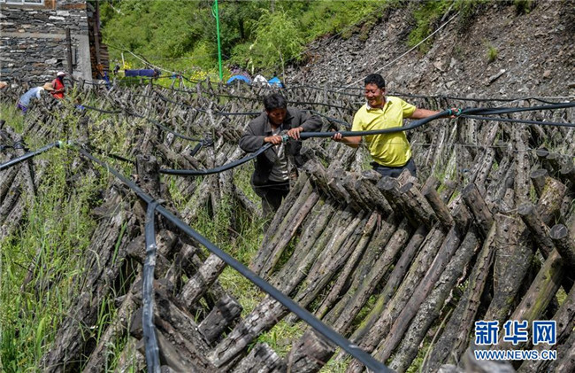 8月10日,四川壤塘縣下大石溝村黨支部書記索更(右一)帶領(lǐng)村民為村集體的青杠木耳種植示范基地更換噴淋水管。新華社記者 張超群 攝.