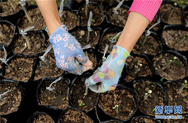 在廣西融安縣大良鎮(zhèn)古蘭村古蘭屯大棚基地,村民在嫁接金桔苗(4月12日攝)。 新華社記者 黃孝邦 攝