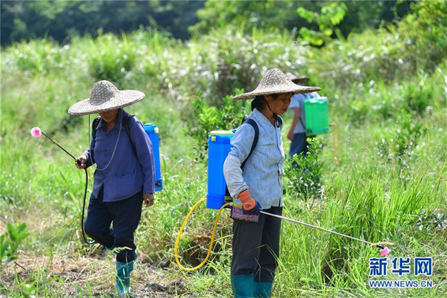 在廣西融安縣大良鎮(zhèn)古蘭村古蘭屯金桔種植基地,村民在田間管護金桔樹(8月18日攝)。 新華社記者 黃孝邦 攝
