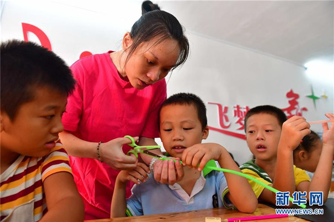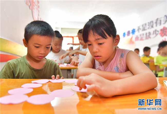 8月17日,在廣西柳州市融安縣“老鄉(xiāng)家園”,孩子們在“七彩假期”手工課上學(xué)做手工。新華社記者 黃孝邦 攝