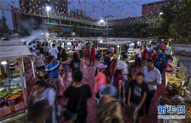 在新疆喀什市歐爾達(dá)路的夜市上,人們在觀光購物(8月18日攝)。新華社記者 王菲 攝